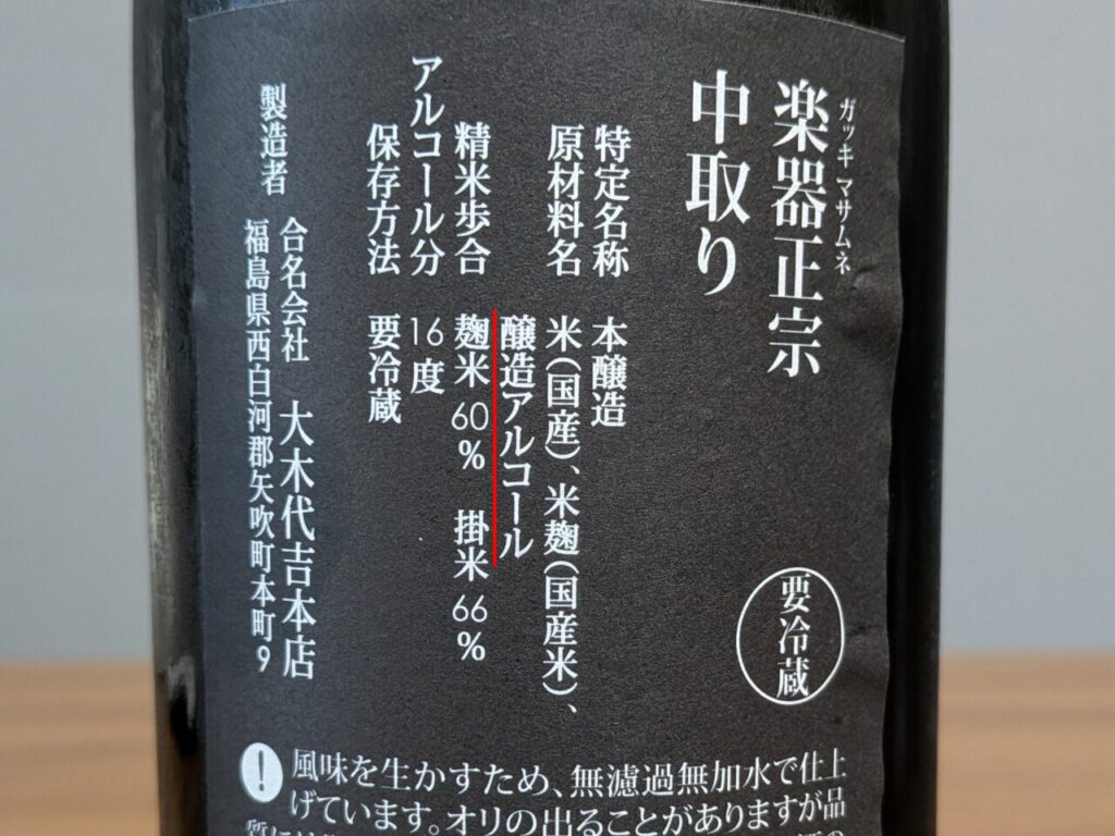 この記事では、アルコールと呼んでいますが、日本酒のラベルでは、原材料名のところに「醸造アルコール」と表記されています。